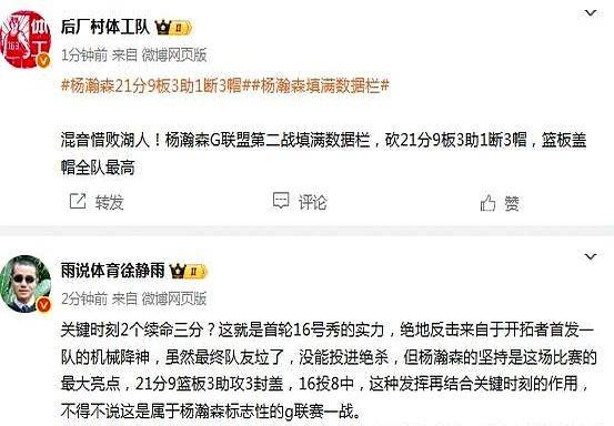 苏群、徐静雨这些知名的篮球评论员,都出来说话了。苏群老师比较冷静,说杨瀚...森的亮点很突出,但还是要适应G联赛的速度和对抗。徐静雨就比较激动了,直接说这就是首轮秀的实力,关键时刻能站出来,太硬了。
