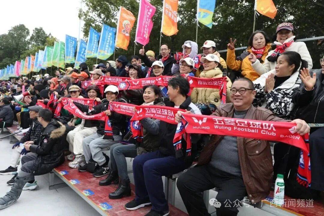 本轮赛事累计超6.5万人现场观赛,其中一大亮点便是球迷助威的专业性与凝聚力——柳州市柳南区队、南宁市江南区队、来宾市兴宾区队均组织了数百人的球迷远征军队伍,远赴客场为球队呐喊助威,统一的助威装备、整齐划一的口号,成为赛场边最亮眼的风景。平果国晶体育场10962名球迷组成红色海洋,江南区队远征军的呐喊与平果本地球迷的助威交相辉映;来宾德比7200人观战创赛区纪录,兴宾区队远征军奔赴同城客场,与武宣本地球迷的呐喊相互呼应,将德比氛围推向高潮;灵川赛场虽寒风凛冽,但灵川助威团声势震天,柳南区队五菱远征军则始终坚守,为球队筑牢“第十二人”防线。此外,宾阳、玉林等地球迷冒寒观赛,不少家庭全家总动员,形成全民追捧的足球热潮,球迷群体覆盖各个年龄段,既有资深球迷专业点评,也有小朋友在家长带领下感受足球魅力,展现出县域足球深厚的群众基础。