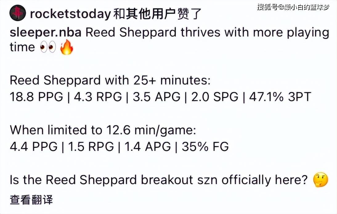 休斯顿媒体Sleeper.nba晒出两组数据,谢泼德场均12.6分钟,只能拿到4.4分1.5篮板1.4助攻,命中率35%,三分命中率33.8%。